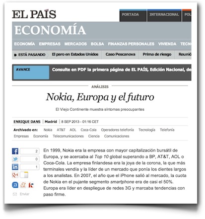 El País publica hoy en su sección de Economía un artículo mío titulado «Nokia, Europa y el futuro» (ver en pdf), en el que hago un paralelismo entre la evolución de Nokia y el futuro de Europa en lo referente a la tecnología.