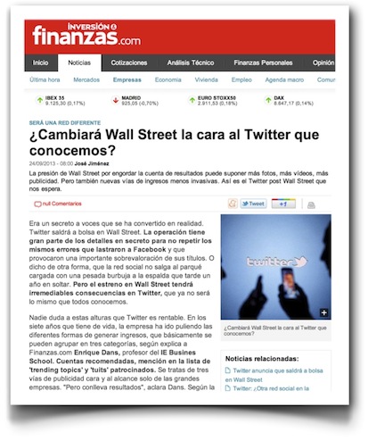 José Jiménez, de Finanzas.com, me llamó para hablar de la próxima salida a bolsa de Twitter, y de hasta qué punto cambiará dicha salida a la compañía. Lo publicó está mañana bajo el título «¿Cambiará Wall Street la cara al Twitter que conocemos?«.