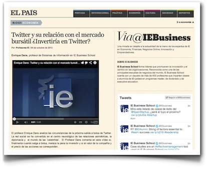 Hoy en El País, en la sección Via@IEBusiness, publican el vídeo que hice recientemente sobre la salida a bolsa de Twitter, pero en inglés, con un montaje diferente, y bajo el título «Twitter y su relación con el mercado bursátil ¿Invertiría en Twitter?»