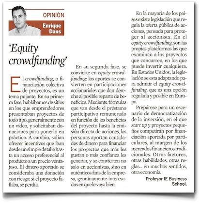 Mi columna de Expansión de esta semana se titula «Equity crowdfunding« (pdf), e intento introducir el término con las limitaciones del papel y con una cierta adaptación al público de un diario económico.