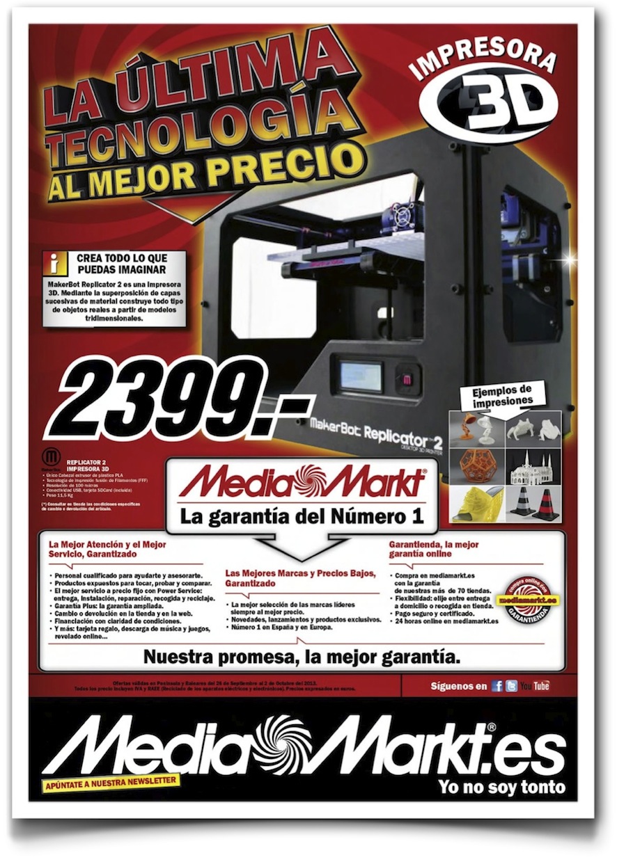 El folleto de MediaMarkt de la semana pasada (pdf), el que se distribuye en domicilios particulares y centros comerciales, traía una interesante novedad: su contraportada, un lugar claramente destacado, estaba dedicada a la MakerBot Replicator 2, una de las impresoras 3D más destacadas dentro de la categoría de mercado de consumo, el segmento en el que se especializa la cadena de distribución alemana. El artículo está también disponible a través de su página web.