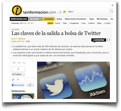 Ana P. Alarcos, de La Información, me envió algunas preguntas sobre la inminente salida a bolsa de Twitter y me llamó posteriormente para hablar sobre su modelo de negocio. Hoy publica dos artículos en los que me cita, «Las claves de la salida a bolsa de Twitter» y «¿De qué vive Twitter y por qué es gratis?«.