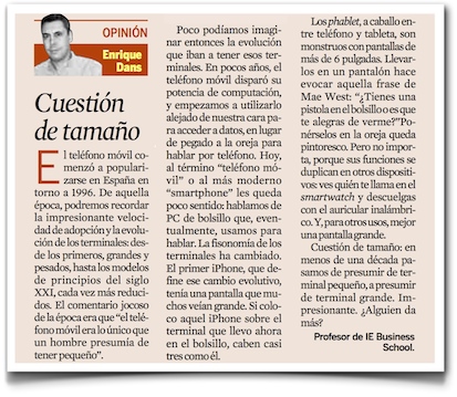 Mi columna de esta semana en el diario Expansión se titula «Cuestión de tamaño«, y se refiere a la evolución histórica de los terminales de eso que llamamos todavía «teléfono móvil» pero que ya hace mucho tiempo que dejó de ser un teléfono y se aproxima mucho más al concepto de «ordenador de bolsillo».
