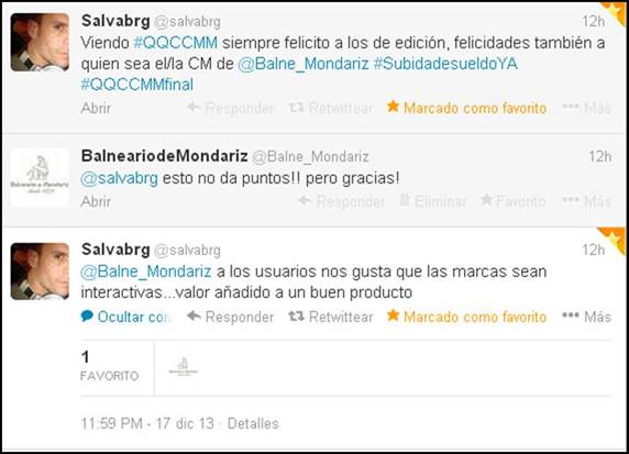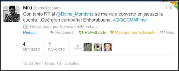 El programa acompañó su emisión con una intensa actividad en Twitter, y propuso para centralizar la conversación los hashtags #QQCCMM4 y #QQCCMMFinal. El primero de ellos llegó a ser segundo en la lista de trending topics nacionales, el segundo llegó a la primera posición durante una hora. A su vez, y utilizando dichos hashtags, la Dirección de Marketing del Balneario consideró interesante lanzar desde su cuenta de Twitter dos promociones coincidiendo con cada uno de los programas: en ambos casos se sorteaban dos packs «Mondariz Enamora» (fin de semana completo con alojamiento, desayuno, cena, programa de ocio y atenciones en la habitación) a cambio de un follow y un retweet. La primera de ellas  hizo que la cuenta del Balneario en Twitter, @Balne_Mondariz, se situase como segunda tendencia en España con más de mil quinientos retweets, incluso por encima del propio hashtag del programa. En la segunda de ellas, asociada ya con un hashtag específico, #invitaMondariz, el resultado fue incluso superior: llegó a situarse como primera tendencia a nivel nacional, con 1345 retweets y 86 favoritos.