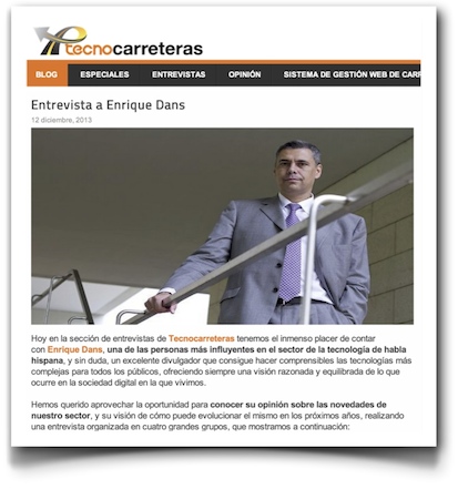César Hinojosa, de Tecnocarreteras, me entrevistó por correo electrónico interesándose por mi opinión sobre algunos de los temas que trata habitualmente en su página al hilo de algunas entradas que he publicado centradas en la automoción y la tecnología, y la publicó hace unos días bajo el título «Entrevista con Enrique Dans«.