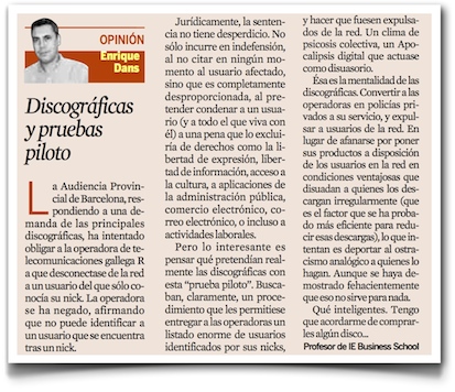 En mi columna de Expansión de esta semana, titulada «Discográficas y pruebas piloto» (pdf), hablo sobre la reciente sentencia de la Audiencia Provincial de Barcelona que reclamaba a la operadora gallega R que suspendiese el servicio de conexión a internet a un usuario al que identificaba únicamente por su nick y su dirección IP. Una sentencia que no será cumplida, al contestar la operadora, con impecable criterio, que no puede identificar a un cliente en función de esa información.