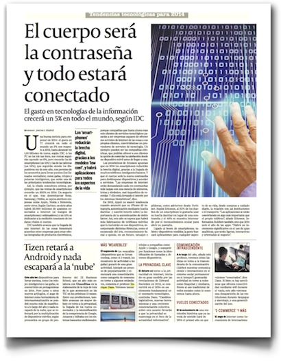 Como todos los años desde hace ya unos cuantos, Marimar Jiménez, de Cinco Días recurrió al claustro de profesores del Área de Sistemas y Tecnologías de Información para dar forma a un mapa de tendencias tecnológicas para el año que empieza, y lo publicó ayer día 2 bajo el título «El cuerpo será la contraseña y todo estará conectado» (ver en pdf).