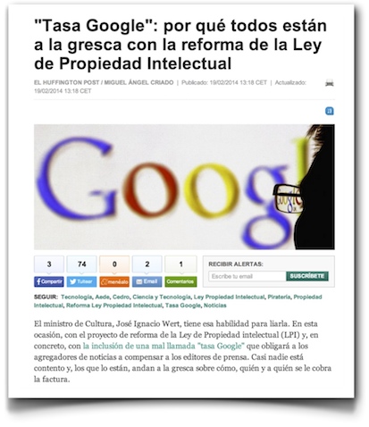 Miguel Ángel Criado me lanzó tres preguntas para El Huffington Post acerca del canon de la AEDE, y ayer me citó en su artículo titulado «Tasa Google»: por qué todos están a la gresca con la reforma de la Ley de Propiedad Intelectual«.