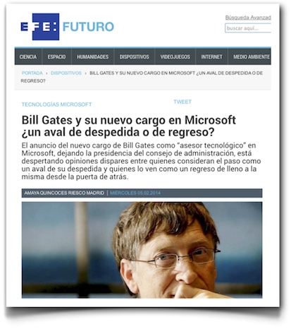 El artículo de Amaya se titula «Bill Gates y su nuevo cargo en Microsoft ¿un aval de despedida o de regreso?«, y ha aparecido, como es habitual en las noticias producidas por EFE, en una buena cantidad de medios españoles y latinoamericanos.