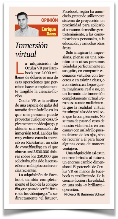 Inmersión virtual - Expansión (pdf, haz clic para verlo sin dejarte los ojos en el intento)Esta semana dediqué mi columna de Expansión a la adquisición de Oculus VR por parte de Facebook por dos mil millones de dólares, intentando explicar a la audiencia de un diario económico la posible trascendencia de la operación y disipar esas dudas que siempre surgen y que apuntan a que vamos a pasar una parte significativa de nuestro futuro con un ladrillo negro puesto delante de nuestros ojos y aislados del mundo que nos rodea. La columna se titula «Inmersión virtual» (pdf)