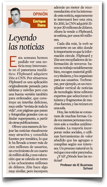 Mi columna de esta semana en el diario Expansión se titula «Leyendo las noticias» (pdf), y utiliza el ejemplo de la adquisición de Zite por parte de Flipboard para ejemplificar la evolución de la lectura de noticias en la web, lo natural que resulta acceder a las noticias desde un número de fuentes cada vez mayor, y el absurdo conceptual que supone pretender «cobrar» a cada una de esas fuentes de tráfico por el uso de titulares y fragmentos de esas noticias. Un reciente manifiesto escrito por Paul Williams hace precisamente referencia a ello: «A manifesto for newsroom decision makers: focus on how people get to your news site«.
