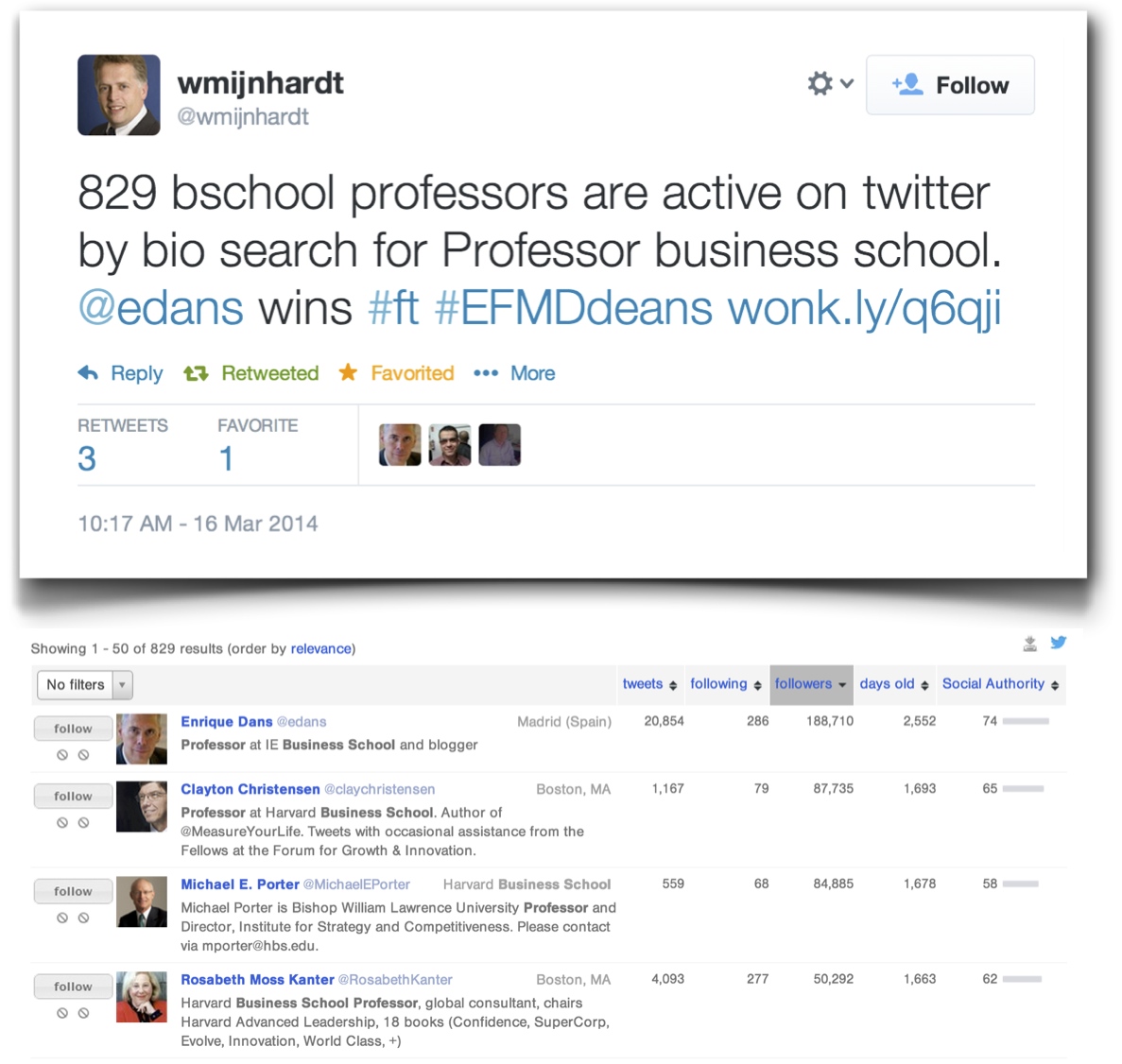 Esta mañana me he encontrado una sencilla observación de Wilfred Mijnhardt en Twitter en la que me mencionaba: utilizó FollowerWonk para buscar profesores de escuelas de negocio en Twitter, encontró 829 y echó un vistazo a variables como el número de tweets, los seguidores, la antigüedad o el nivel de autoridad social. Una lista que me pone arriba del todo, por encima de «monstruos» como Clayton Christensen, Michael Porter o Rosabeth Moss Kanter, que vienen a ser ese tipo de figuras en las que, en muchos sentidos, llevas toda la vida mirándote, o cuyos libros y artículos has estudiado. No tiene más valor que el que tiene, no creo que este tipo de cuestiones puedan medirse en modo exclusivamente cuantitativo o competitivo, y seguramente faltarán ahí muchos profesores que simplemente no han puesto en su bio que lo son… pero la verdad es que hace cierta ilusión :-)