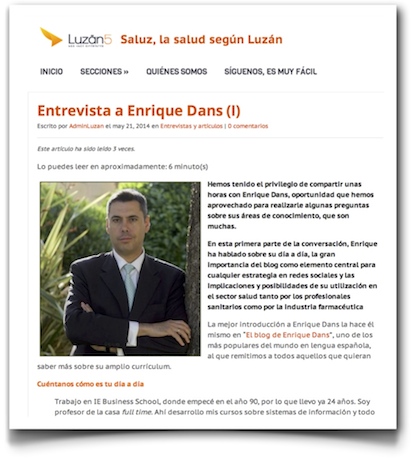 Giancarlo Giansante me grabó una entrevista bastante larga para Luzán 5, una empresa con la que he colaborado en algunos eventos y conferencias para el sector farmacéutico, y ha tenido además la santa paciencia de transcribirla íntegra (con el rollo que yo tengo :-) Hablamos un poco de todo: mis rutinas de trabajo, la comunicación online, la aplicación de este tipo de estrategias en el entorno farmacéutico y de la salud, etc.