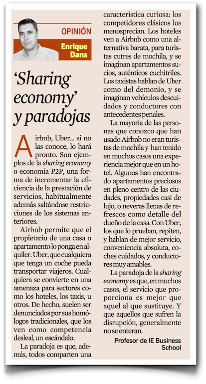 Mi columna en el diario Expansión de esta semana se titula «Sharing economy y paradojas» (pdf), y hace referencia a un tema que me parece sumamente interesante: la forma en la que las industrias, sectores y competidores tradicionales afrontan la llegada de la disrupción por parte de nuevos modelos.