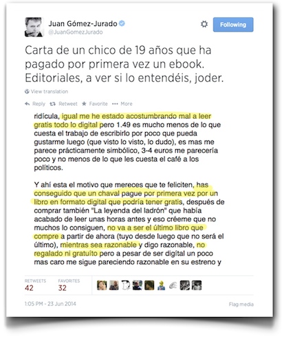 Me llama la atención un tweet de Juan Gómez-Jurado, sin duda uno de los escritores más activos en Twitter y más participativos en la discusión sobre el futuro de la industria editorial, en el que comenta su satisfacción por un mensaje que ha recibido de un chico de diecinueve años en el que le dice que ha comprado su libro, que es el primer libro electrónico por el que paga pudiendo haberlo obtenido gratis, y que el mérito es fundamentalmente suyo.