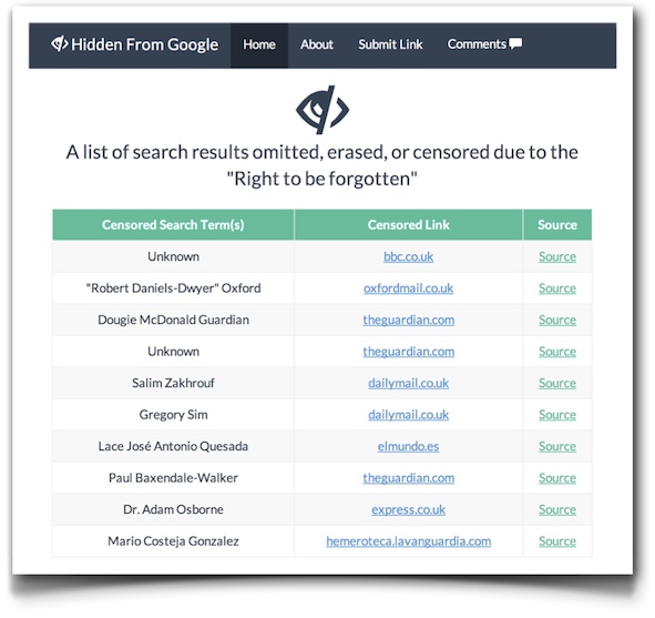 No han pasado ni dos meses de la equivocada decisión del Tribunal de Justicia de la Unión Europea que pretende asentar el absurdo concepto del «derecho al olvido» mediante el procedimiento de eliminar resultados de los buscadores, cuando ya han surgido reacciones para evitar sus efectos: un programador, Afaq Tariq, crea una página titulada «Hidden from Google«, que recoge los resultados censurados del buscador, enviados por todo aquel que se moleste en comprobarlos.