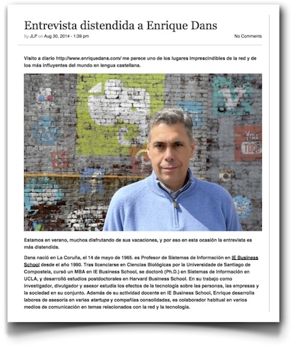 José López Pérez, lector habitual, me hizo una pequeña entrevista hace un par de días para su página, No Solo Cine. La publicó ayer bajo el título «Entrevista distendida a Enrique Dans«.