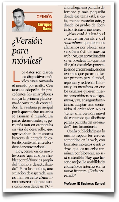A medida que vemos elevarse el porcentaje de accesos desde plataformas móviles en nuestras páginas web, tendemos a pensar en el desarrollo de una versión móvil para las mismas, sin darnos cuenta de que, en realidad, ese razonamiento esconde un fallo conceptual: hacer «una versión» supone precisamente eso, «versionar», «adaptar», «hacer encajar» en un dispositivo con las características de un smartphone algo que, originalmente, diseñamos para ser visto en la pantalla de un ordenador. Lo que vengo a argumentar en mi columna es que, en realidad, la pujanza del fenómeno ya no permite esa mentalidad de «adaptación», sino que pide a gritos una reconceptualización desde su base.