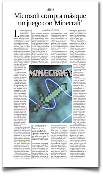 Marimar Jiménez me pidió que le resumiese en un correo electrónico las que eran, en mi opinión, las claves en positivo y en negativo de la adquisición de Mojang, desarrolladores de Minecraft, por parte de Microsoft. Hoy me cita en su artículo en Cinco Días titulado «Microsoft compra más que un juego con Minecraft» (pdf).