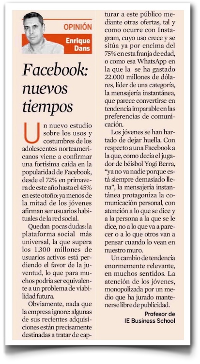 Obviamente, nada que la empresa ignore: algunas de sus recientes adquisiciones están precisamente destinadas a tratar de capturar a este público mediante otras ofertas, tal y como ocurre con Instagram, cuyo uso crece y se sitúa ya por encima del 75% en esta franja de edad, o como esa WhatsApp en la que la compañía se ha gastado veintidós mil millones de dólares, líder de una categoría, la mensajería instantánea, que parece convertirse en tendencia imparable en las preferencias de comunicación.