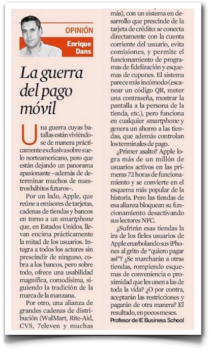 Para mi columna de los viernes en Expansión, titulada «La guerra del pago móvil» (pdf), he retomado un tema sobre el que ya había escrito, la guerra entre el sistema de pago mediante smartphone de Apple y algunas de las cadenas de distribución más grandes de los Estados Unidos que lanzan su propio sistema, y le he dado forma de mini-caso, intentando llevar al lector a lanzar sus propias hipótesis. Me parece una de esas situaciones interesantes de las que pueden derivarse análisis y conclusiones de cierto valor no solo para los interesados en la evolución de la industria tecnológica, sino también en otras como la banca o la distribución.