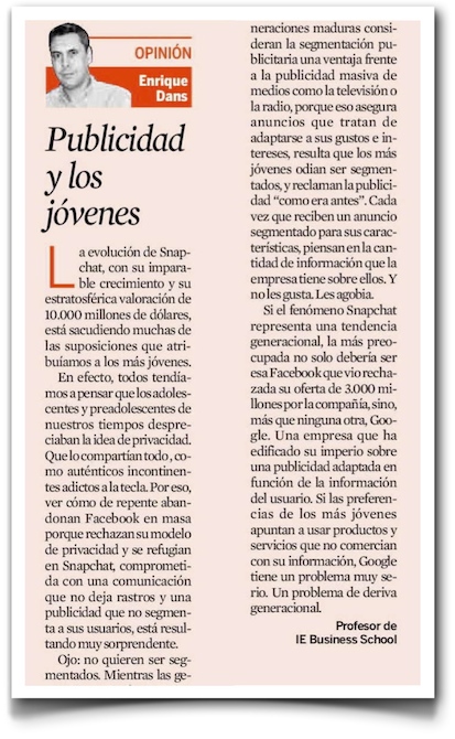 Mi columna de Expansión de esta semana, que al menos cuando yo la envié a redacción se titulaba «Derivas generacionales» (pdf), habla del interesantísimo cambio de tendencia que estamos viviendo con el fenómeno Snapchat, evidenciado en la primera campaña publicitaria que pusieron en circulación en su red el pasado domingo. Una campaña que no hace uso de una de las características de la red que hasta el momento parecían fundamentales: la capacidad de segmentación.