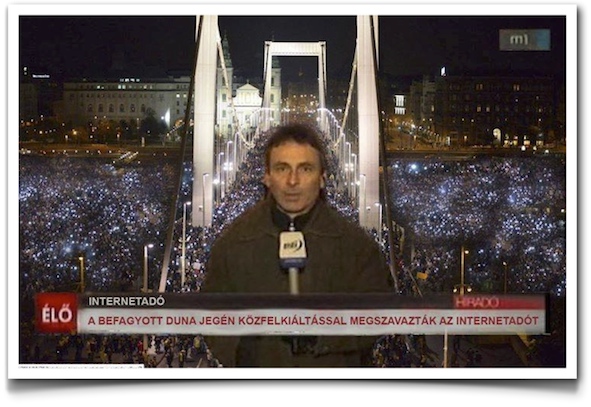 Un gobierno en sus más altas cotas de popularidad, con un Viktor Orbán recién reelegido el pasado abril para su tercer mandato consecutivo con una mayoría absoluta de más de dos tercios del censo, que de repente decide sacarse de la manga un impuesto a internet expresado en una cantidad aproximada de cincuenta céntimos de euro (150 forints) por gigabyte. Ante el anuncio, una página de Facebook creada para la ocasión, «Cientos de miles contra en impuesto de internet» consigue rápidamente más de doscientos mil seguidores (en un país de unos diez millones de habitantes), y es utilizada para coordinar marchas de protesta nocturnas en las calles en las que los ciudadanos levantan la pantalla encendida de sus teléfonos móviles, obteniendo un efecto sumamente llamativo.