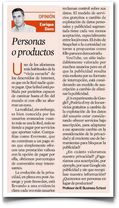 Mi columna en el diario Expansión de esta semana se titula «Personas o productos» (pdf), y es una especulación sobre si tendría sentido pensar que un desplazamiento en las preferencias de los usuarios, generacional o de otro tipo, nos llevase a un escenario en el que los servicios financiados mediante el análisis de los datos del cliente de cara a la administración de publicidad contextualizada y segmentada perdiesen progresivamente su atractivo.