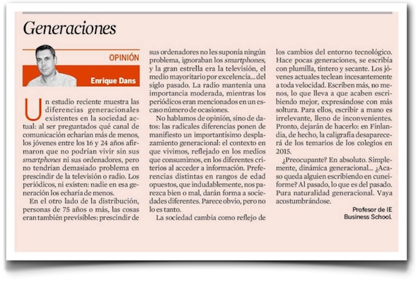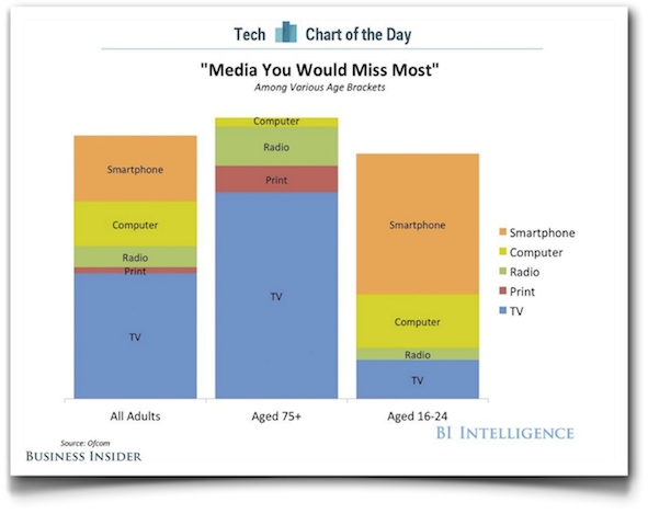 Mi columna de esta semana en el diario Expansión se titula «Generaciones» (pdf), habla de cambios en el escenario tecnológico y de la manera en que afectan a las sucesivas generaciones: está en parte provocada por los ecos de la discusión en torno a la medida de Finlandia de eliminar la enseñanza de la caligrafía en las escuelas y sustituirla por la práctica en el uso del teclado, y por otro lado, por el interesante gráfico utilizado recientemente por Henry Blodget, CEO de Business Insider, en el que preguntaba qué canal de comunicación echarían más de menos las personas y confrontaba los diferentes resultados obtenidos por el segmento de «entre 16 y 24» años frente al de «más de 75». Mientras los mayores ignoran completamente el smartphone, en gran medida el ordenador, y se mantienen fieles a la televisión y radio, y, en mucha menor medida, a los periódicos, los más jóvenes se centran precisamente en sus smartphones y sus ordenadores, reducen drásticamente su preferencia por la televisión, prácticamente ignoran la radio, y no saben ni lo que es un periódico.