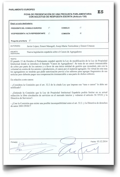 Tres preguntas formuladas por cuatro eurodiputados representando a grupos diferentes, @fjavilopez, @ernestmaragall, @ernesturtasun y @jmterricabras, han planteado preguntas como hasta qué punto puede introducirse una cláusula como esa en una ley sin cumplir con la obligación de notificar a la Comisión, y si podría vulnerar o ser incompatible con varias normas comunitarias. El promotor en Bruselas de la iniciativa ha sido el abogado (y sin embargo amigo :-) @josepjover, que ya tuvo una muy destacada implicación en las actuaciones que terminaron en su momento con anulación del polémico canon de la SGAE.
