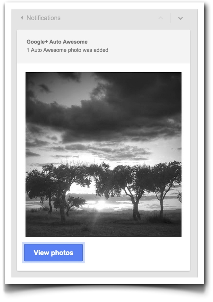 Me despistaba lo de «Google+ Auto Awesome», y no lo relacionaba con ninguna acción directa mía, hasta el punto que decidí empezar a investigar. La noche anterior, mi smartphone, un Motorola Moto X, me había propuesto de manera «espontánea» utilizar la función de auto-backup de mis fotografías, que sí había utilizado previamente en otros terminales, pero no había activado en este. Esta mañana, vi que había añadido algunas fotos al backup y que estaban «listas para compartir», pero no le hice mucho caso. Y ahora, me encontraba con eso.