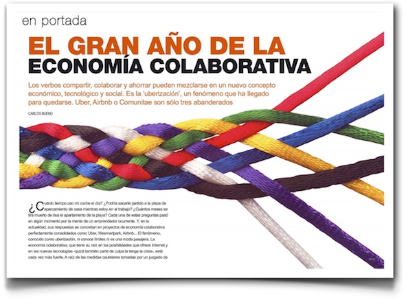 Mantuve una conversación telefónica larga con Carlos Bueno, de El Economista, sobre la sharing economy, y ayer publicó un artículo titulado «El ‘fenómeno Uber’ se extiende a decenas de sectores, cambiando las reglas de juego» (pdf) encuadrado en un reportaje titulado «El gran año de la economía colaborativa» (pdf), en el que me cita bastante.