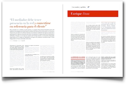 Entrevista diciembre 2014 - AseguradoresCon motivo de una conferencia que tuve la oportunidad de impartir recientemente en Sevilla para el Colegio de Mediadores de Seguros, me hicieron esta entrevista para la revista Aseguradores, que han titulado como «El mediador debe tener presencia en la red y convertirse en referencia para el cliente«.