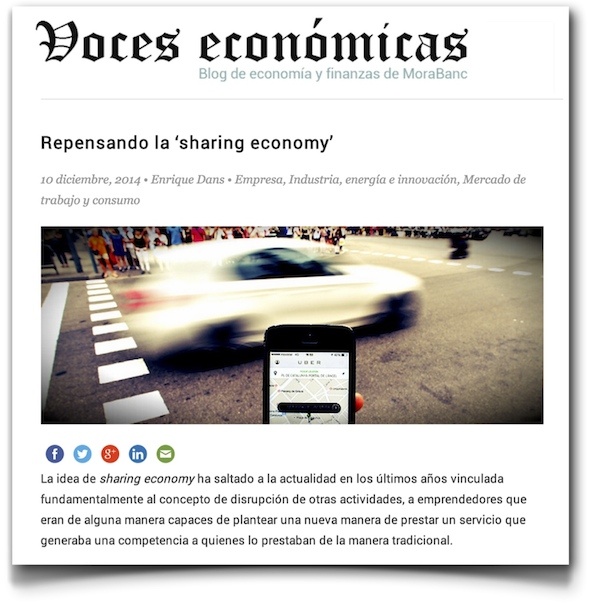 Desde Voces Económicas, el blog de Mora Banc, me pidieron un artículo sobre la sharing economy, que publicaron ayer. Se titula «Repensando la sharing economy«, y lo puedes leer en español o en catalán.