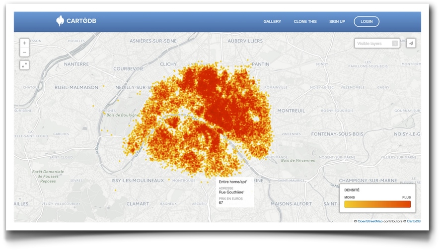 La ilustración que ves es un un mapa interactivo elaborado con CartoDB que representa las propiedades ofertadas en alquiler en París a través de Airbnb, elaborado por Julien Guillot y comentado en este tweet por la propia CartoDB. Es una de las visiones más claras que he visto de lo que realmente representa la llamada «economía de la abundancia», y del efecto que una plataforma como Airbnb puede generar sobre la oferta turística de una ciudad: una nube enormemente densa de puntos por los que, al pasar el ratón, se despliega información de características y precio, y que claramente rellena con enorme eficiencia el espacio disponible bajo la curva de oferta y demanda, de una manera muchísimo más completa de lo que lo hacía la oferta hotelera tradicional. Si no lo has visto en interactivo, te recomiendo que lo hagas, es sencillamente impresionante: en esa nube hay de todo: habitaciones en pisos compartidos por pocas decenas de euros, hasta apartamentos de lujo en la zona más céntrica de la ciudad por varios miles. Aquí tienes la versión interactiva: