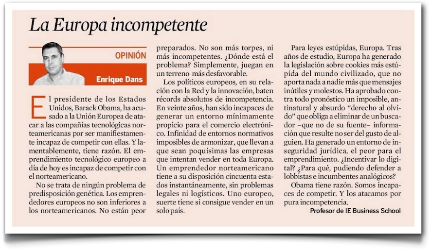 Mi columna en el diario Expansión de esta semana se titula «La Europa incompetente» (pdf), y viene al hilo de las recientes declaraciones de Barack Obama en la fantástica entrevista realizada por Kara Swisher en las que afirmaba que «Europa ataca a las compañías tecnológicas norteamericanas porque no es capaz de competir con ellas«.