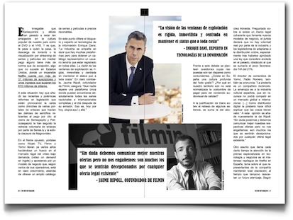 Paula de Aguirre me envió algunas preguntas por correo electrónico para su reportaje «Internet y el cine: ¿una historia de amor?» en The Way Out Magazine, en el que intervienen además Jaume Ripoll, cofundador de Filmin, el abogado Carlos Sánchez Almeida, el director de contenidos de Yomvi, Pablo Romero, y el director de negocios de Filmax, Carlos Rojano.