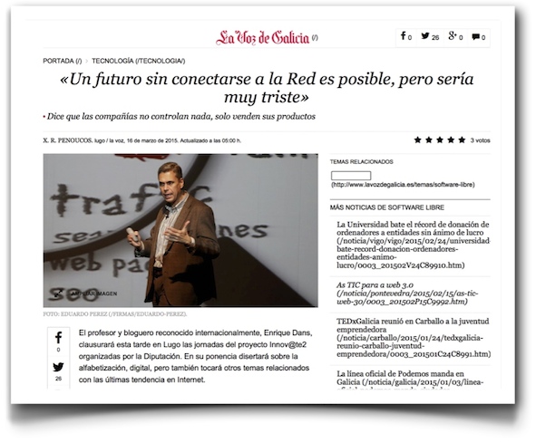 Estuve dando una charla sobre la evolución de la red y las dinámicas de alfabetización digital en la Diputación de Lugo, y Xose Ramón Penoucos me hizo una entrevista larga para La Voz de Galicia, el periódico que se leía en casa de mis padres cuando yo vivía en ella, cosa que siempre hace cierta ilusión :-)