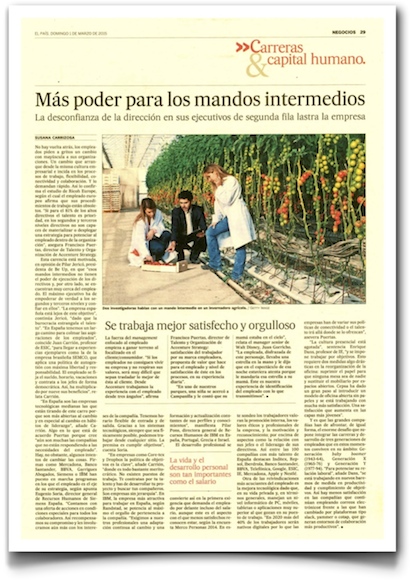 Más poder para los mandos intermedios - El País (pdf)Susana Carrizosa, de El País, me llamó para hablar de los factores de retención y fidelización de los empleados en las empresas, un tema que considero de una importancia creciente, sobre todo en mercados de trabajo tan patentemente disfuncionales como el español. El pasado domingo publicó algunos de mis comentarios en su reportaje titulado «Más poder para los mandos intermedios» (pdf)