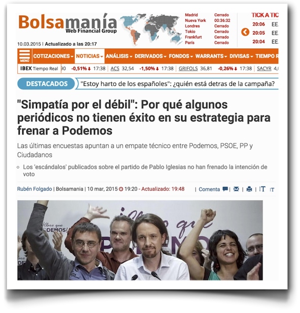 Rubén Folgado me envió un correo electrónico preguntándome sobre el efecto erosión (o no) que están teniendo algunas informaciones destacadas reiterativamente por medios AEDE sobre formaciones como Podemos, y ayer me citó brevemente en su artículo en Bolsamanía titulado «Simpatía por el débil: por qué algunos periódicos no tienen éxito en su estrategia para frenar a Podemos«.