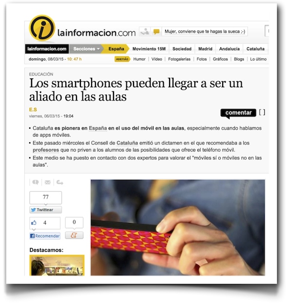 Me llamaron de La Información justo antes de entrar en una clase – hablamos diez minutos escasos y no pude quedarme ni con el nombre de la periodista que me llamó, perdón por no citarla) – para hablar sobre el uso de smartphones en la educación, y la diferencia de actitud en el caso entre las comunidades autónomas españolas entre aquellas que se obstinaban en su prohibición a toda costa frente a otras, como Cataluña, que recomendaban a los profesores que los integrasen en el proceso educativo como parte del equipamiento tecnológico disponible. Ayer se publicó una noticia, titulada «Los smartphones pueden llegar a ser un aliado en las aulas«, en la que me citan brevemente.