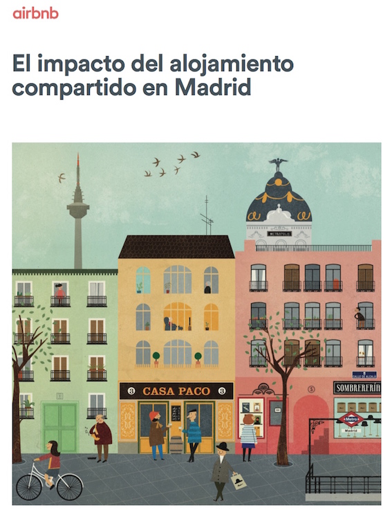 Esta mañana tuvo lugar la presentación del estudio «El impacto económico de Airbnb en Madrid» (pdf, 14.1 MB) desarrollado por la propia compañía y por el profesor Francesco D. Sandulli, de la Universidad Complutense de Madrid, a partir de datos de ocupación, encuestas sobre anfitriones y huéspedes de la compañía, datos del INE sobre magnitudes económicas, e información de Cleantech Group sobre impacto medioambiental. Anteriormente se había presentado un estudio similar referente a Barcelona, con magnitudes coherentes: según los datos que maneja la compañía, mientras su actividad genera en Madrid un total de 323 millones de euros y 5.130 puestos de trabajo, en Barcelona llega a suponer un total máximo estimado de 128 millones y 4.310 empleos.