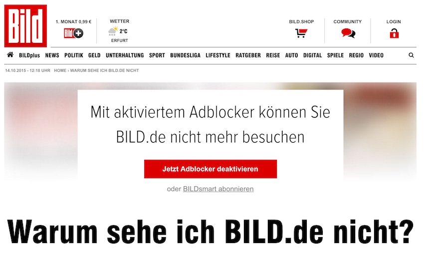 Tienes una casa. Se llama Bild. Ofreces contenidos abyectos y una publicidad intrusiva y que toca las pelotas. Y vas y no dejas entrar a quien instala bloqueadores. Es tu casa ¿Y que? Sencillamente, a quien no le guste, que no entre.