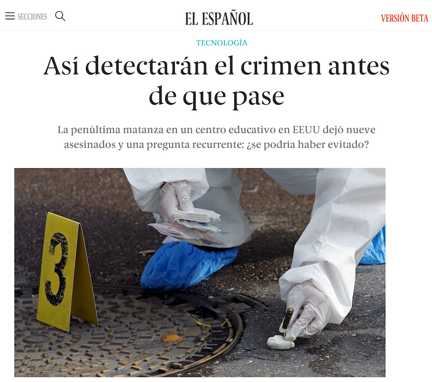 La primera noticia que me cita en El Español, medio de cuyo consejo de administración formo parte, no es una columna mía (que escribiré y enviaré la primera esta tarde), sino una noticia escrita por Pablo Romero acerca de un desarrollo de análisis multivariante llevado a cabo por Hitachi y alimentado con registros de criminalidad histórica, transporte público, meteorología y conversaciones en redes sociales, que algunos departamentos de policía están probando como herramienta para tratar de optimizar su presencia en ciertas zonas, reducir los índices de criminalidad, o incluso prevenir algunas acciones específicas.
