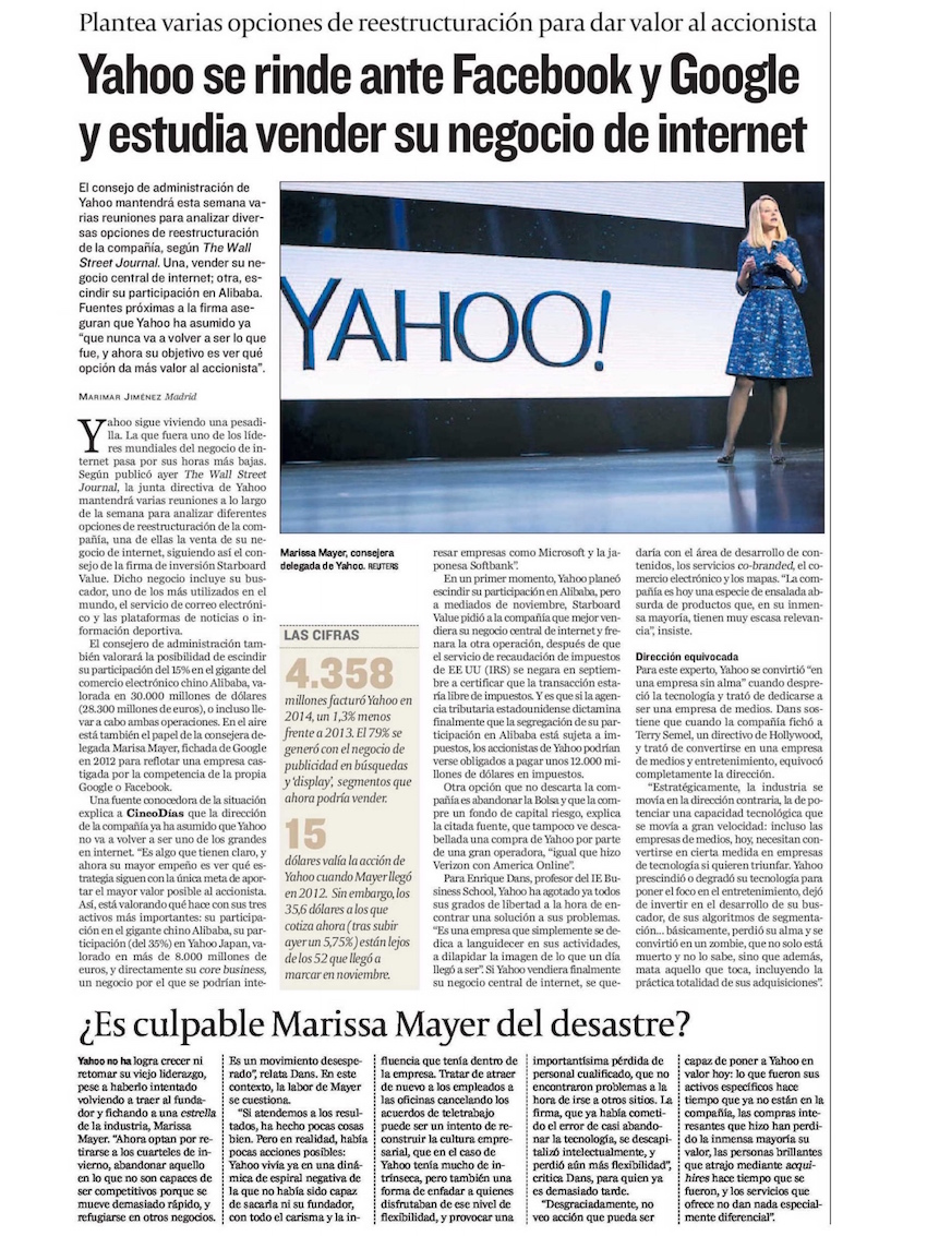 Marimar Jiménez, de Cinco Días, me envió algunas preguntas por correo electrónico para pedirme mi opinión sobre la noticia publicada originalmente en The Wall Street Journal en la que se detalla cómo el consejo de administración de Yahoo! está considerando la venta de los activos estratégicos de la compañía en todos los negocios relacionados con internet, y hoy incluye buena parte de mis comentarios en su artículo, titulado «Yahoo se rinde ante Facebook y Google y estudia vender su negocio de internet» (pdf).