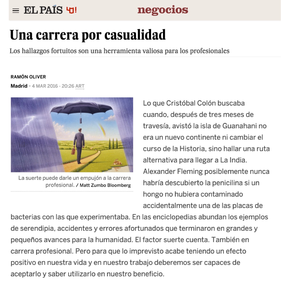 , de El País, me envió algunas preguntas por correo electrónico para hablar acerca del papel de las casualidades y la serendipia en las carreras empresariales, y ayer lo publicó bajo el título «Una carrera por casualidad» (pdf) en la versión electrónica y «La casualidad marca una carrera» (pdf) en la versión impresa.