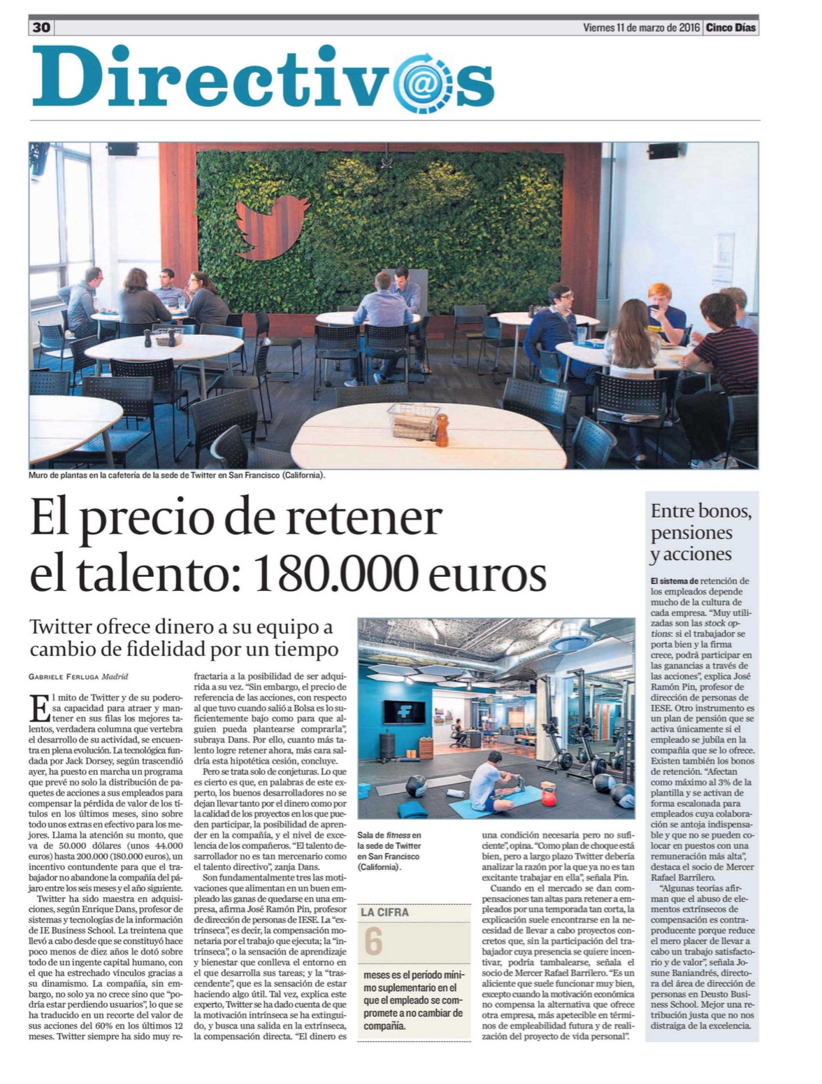 Gabriele Ferluga, de Cinco Días, me llamó hace un par de días para hablar sobre la noticia de que Twitter estaba poniendo en práctica una estrategia de retención de talento consistente en el uso de incentivos directos, como importantes bonuses y paquetes accionariales para compensar la caída en el valor de su acción, y ayer me citó junto con declaraciones de otros profesores en su artículo titulado «El precio de retener el talento: 180.000 euros» (pdf)