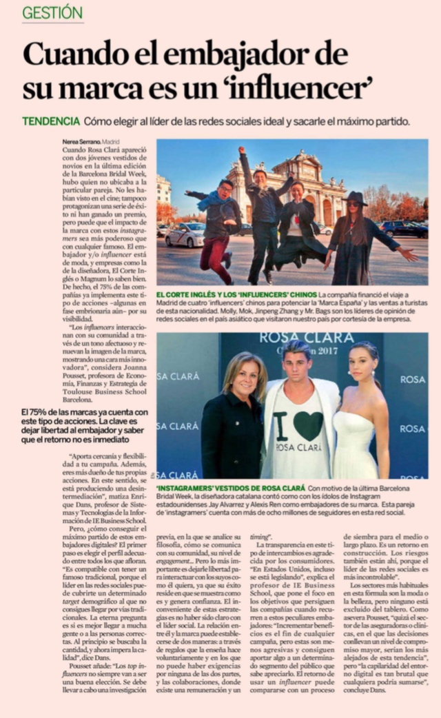 Cuando el embajador de su marca es un "influencer" - Expansión (pdf)He escrito sobre influencers en numerosas ocasiones, la última ésta que generó cierto movimiento en redes sociales, así que me gustó que Nerea Serrano, de Expansión, me llamase para hablar sobre el tema en su artículo titulado «Cuando el embajador de su marca en un ‘influencer’» (pdf), específicamente sobre el uso cada vez mayor que cada vez más marcas hacen de los llamados «influencers no tradicionales» – más allá del clásico «famoseo» polivalente y de toda la vida que lo mismo te anuncia un yogur laxante que un coche deportivo.