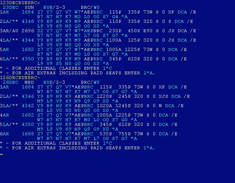 Basta con echar un vistazo a la pantalla que se abre en el mostrador de cualquier aerolínea o agencia de viajes: sea a toda pantalla o en una ventana, veremos un espacio generalmente azul o negro en entorno carácter, que viene a ser el acceso al sistema de reservas utilizado por la mayoría de las líneas aéreas, el conocido como Transaction Processing Facility o TPF, un sistema de código cerrado diseñado por IBM en 1979 como evolución de su Airline Control Program (ACP), puesto en marcha en 1965. El núcleo de ese sistema original, SABRE (Semi-Automated Business Research Environment), al que corresponde la captura de pantalla que ilustra esta entrada, sigue aún en funcionamiento. La última actualización significativa del sistema fue hecha por IBM hace aproximadamente una década.