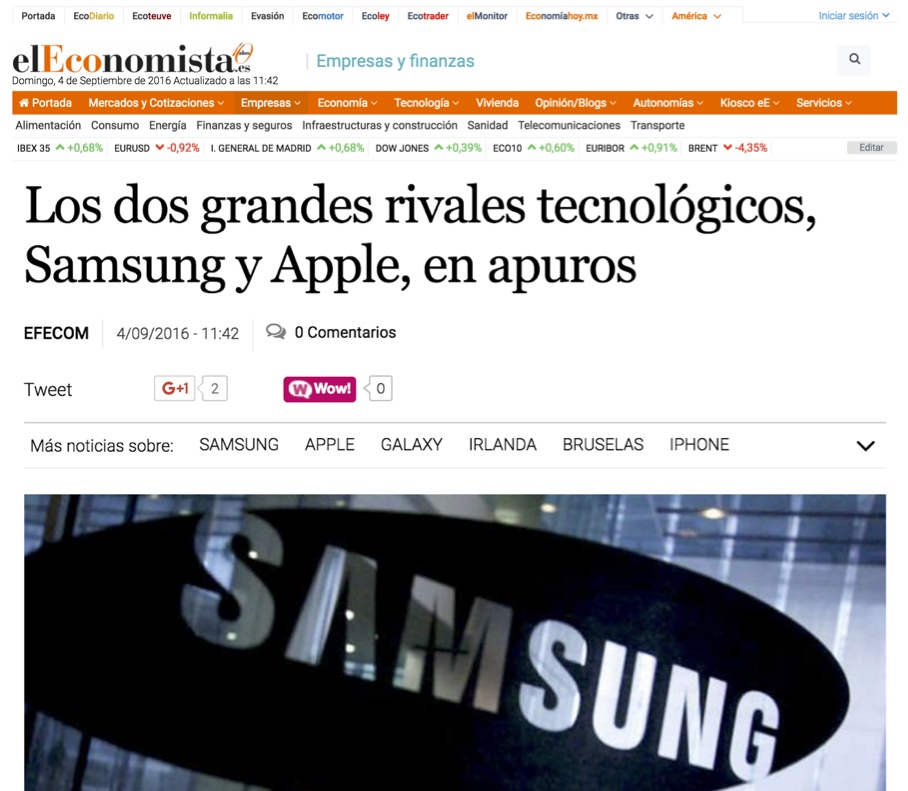 Emilia Pérez, de EFE, me llamó para hablar sobre los recientes problemas de Apple con respecto a los impuestos en Europa, y de Samsung con la retirada de su Galaxy Note 7 por un defecto en sus baterías, y ayer pude ver en medios como El Economista algunos de mis comentarios, junto con los de Antonio Ortiz, bajo el título «Los dos grandes rivales tecnológicos, Apple y Samsung, en apuros» (en pdf).